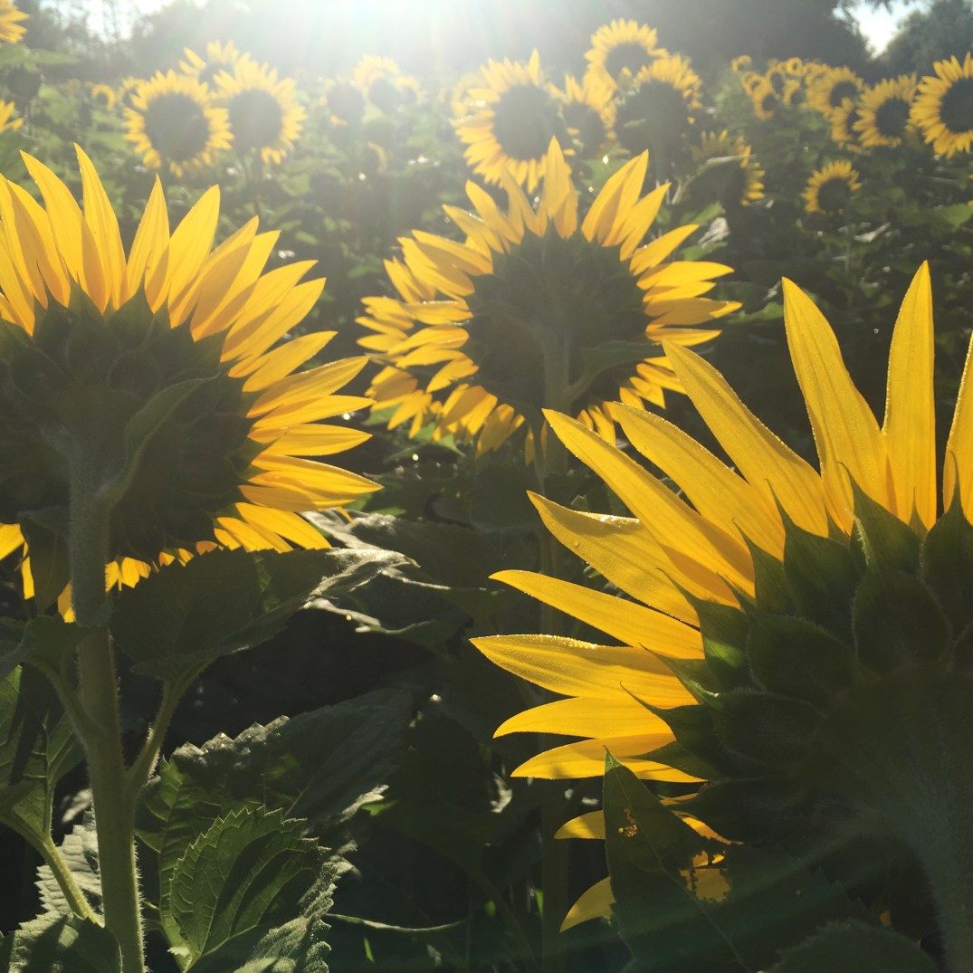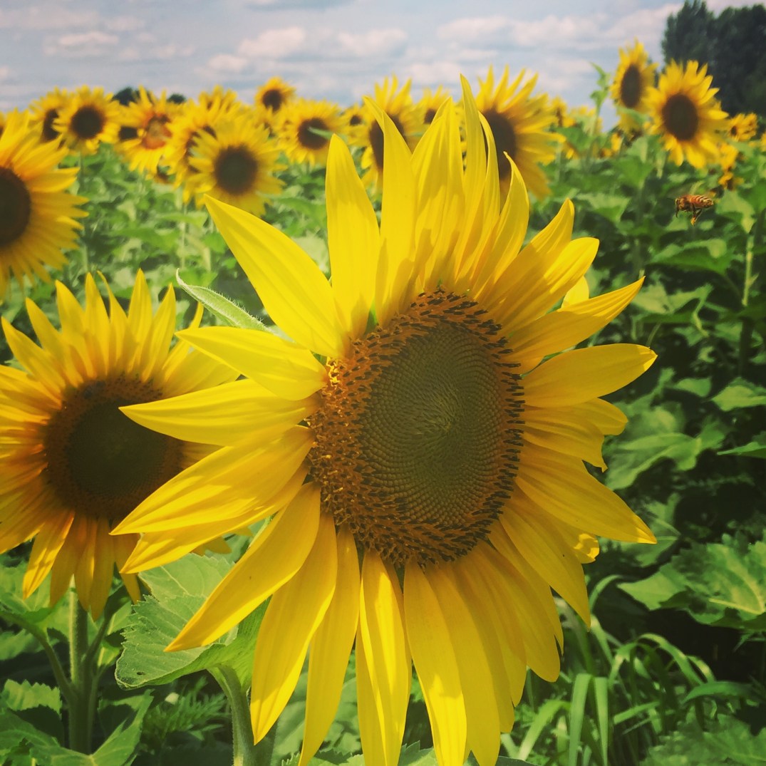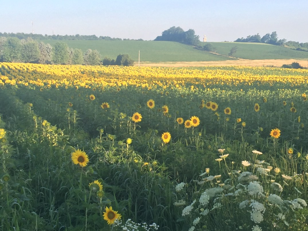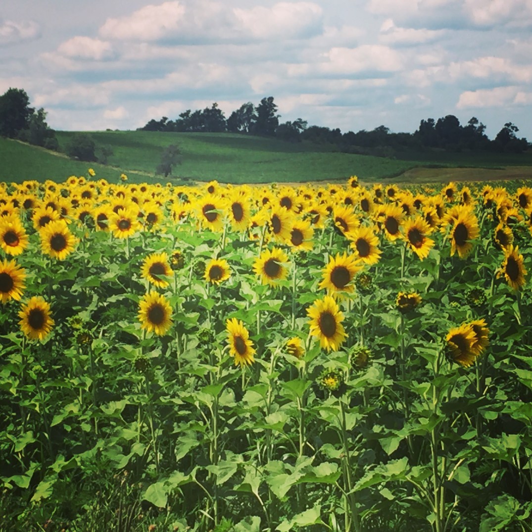 Every year I plant my own little patch of sunflowers – many different varieties. Sometimes the chipmunks eat my seeds before they sprout and sometimes the weather isn’t conducive to growing huge sunflowers- sometimes I’m lucky and sometimes I’m not. I always hope that the farmer down the road plants fields of sunflowers and every few years he does. Boo! for crop rotation and boring feed corn! Yay! For sunflower fields that go on forever! This year I got lucky!